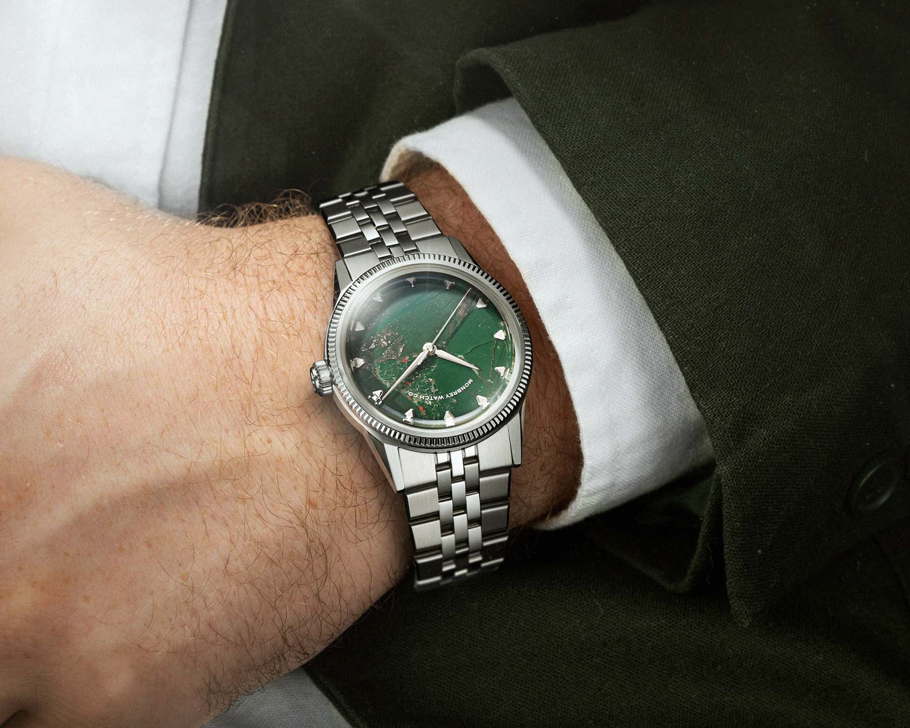 At the heart of each Trinova is a dial crafted from natural materials — each with its own distinct character and texture. The lineup includes Charoite, Bloodstone, Sodalite, Burlwood, and Onyx, each chosen for its depth and interplay with light.