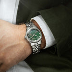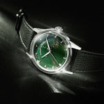 A study in contrast and depth, the Trinova in Natural Bloodstone features a dial with a deep green base punctuated by striking red flecks. Paired with a classic black Epsom Italian leather strap, this model exudes a subtle yet powerful character, blending natural artistry with timeless design.