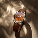 The Trinova in Natural Burlwood is a timepiece that blurs the line between wood and stone. Unlike the linear grain of typical wood, the burlwood dial showcases a stunning, wave-like pattern that gives it a unique, almost marbled appearance reminiscent of a natural stone. Each piece is a unique tapestry of intricate, organic forms. The watch is completed with a rich brown Italian vegetable-tanned leather strap, highlighting its authentic and earthy appeal while showcasing the captivating beauty of this rare wood.